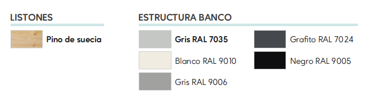 Listones de madera de pino de Suecia cepillado de 30 mm. de espesor. Con cantos biselados y barnizados con poliuretano. Patas independientes de tubo de acero de 30x30x1,5 mm. soldadas y pintadas en epoxi con recubrimiento de 60 micras. Tacos antideslizantes (sin nivelaci贸n). Refuerzo met谩lico entre patas en los modelos sin zapatero. Fabricado en chapa de 1,5 mm.
