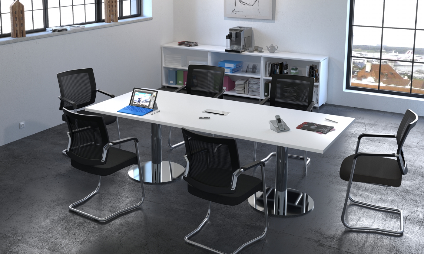 Mesa de reuniones rectangular Colina, con base cil铆ndrica color platino