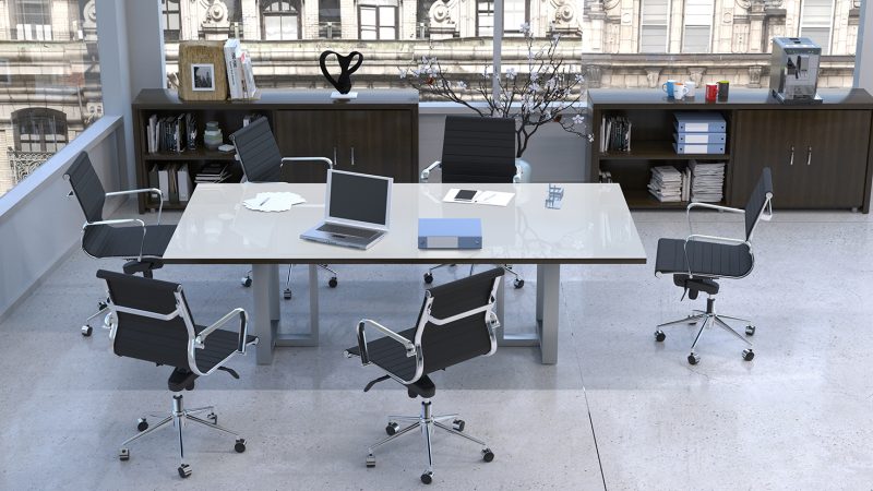 Moldura DM 10 mm en gris y bilaminado de 19mm en mesas de reuni贸n.