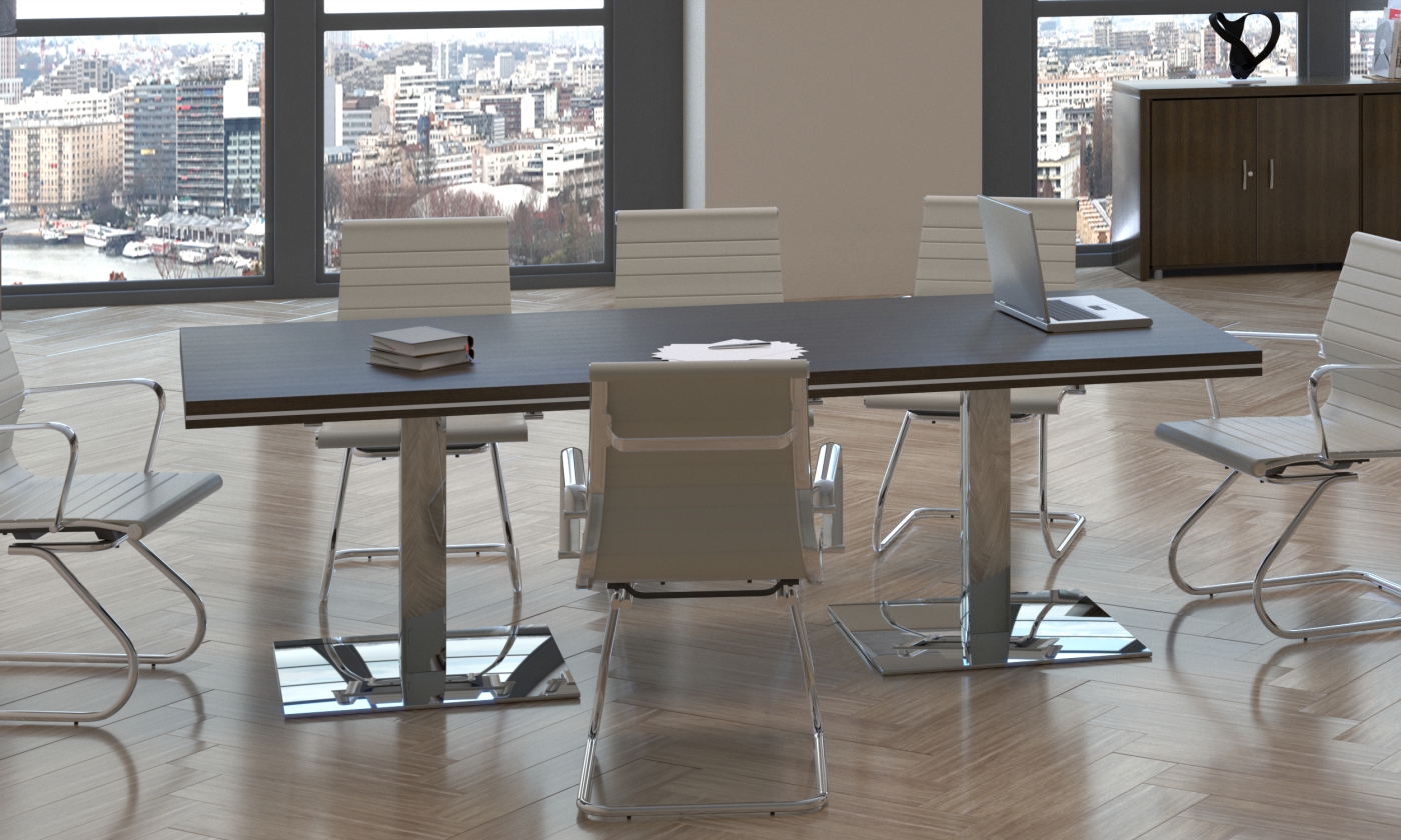 Moldura DM 10 mm en gris y bilaminado de 19mm en mesas de reuni贸n.