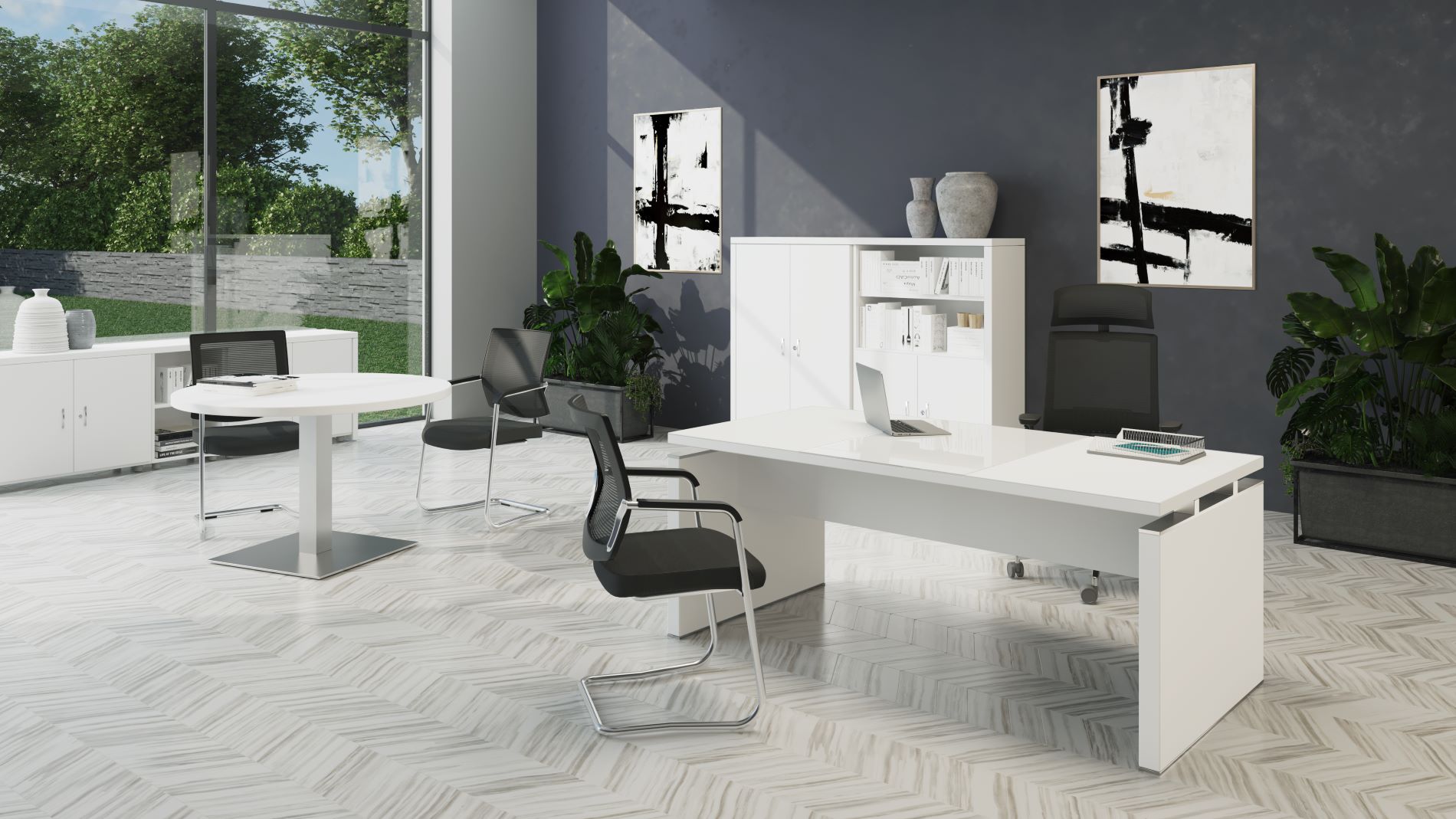 Tapa de mesa fabricada en bilaminado de 40mm. Bases fabricadas en bilaminado de 60 mm.
