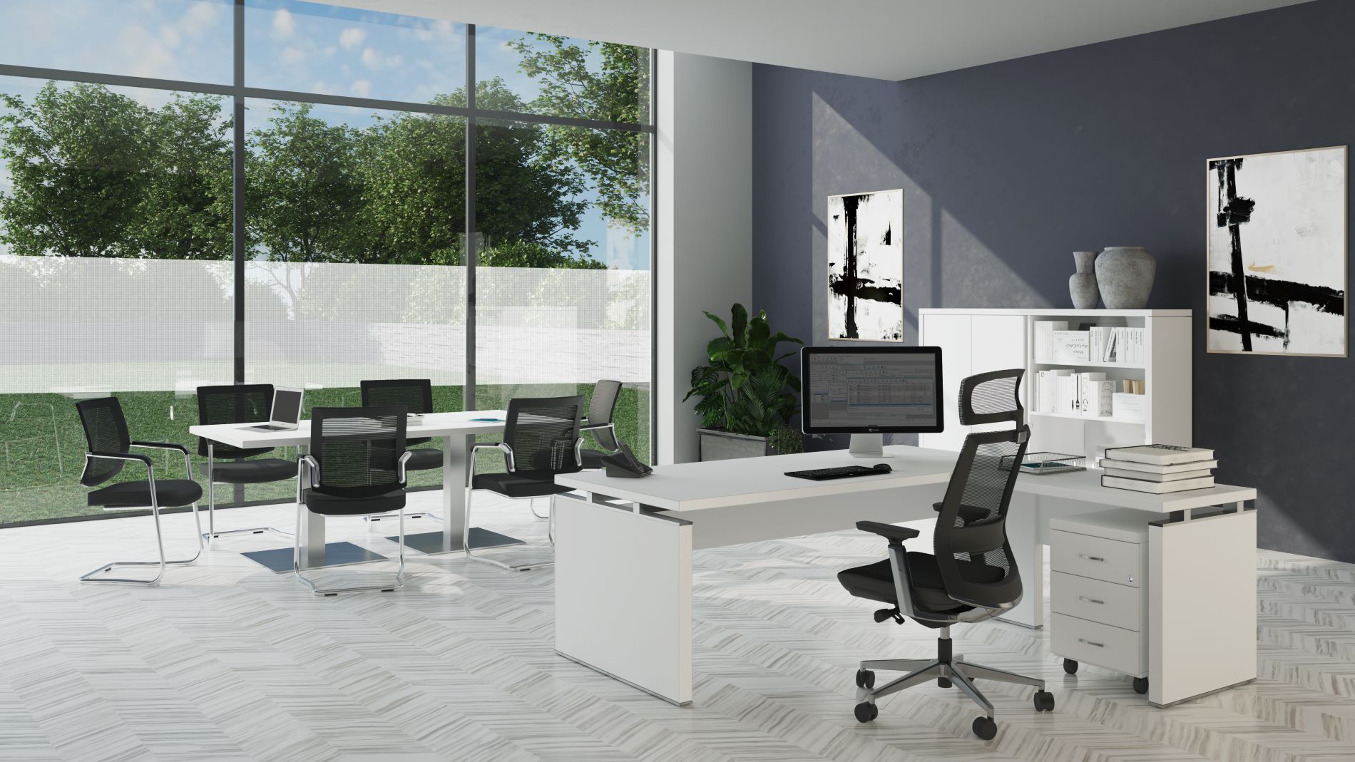 Tapa de mesa fabricada en bilaminado de 40mm. Bases fabricadas en bilaminado de 60 mm. Con vade de vidrio 8 mm cajeado en tapa de mesa.