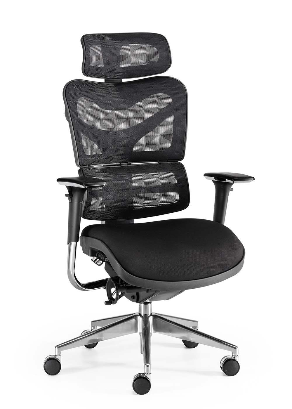 Respaldo alto con soporte lumbar y cabecero regulable, tapizado en malla de alta resistencia, color negro.